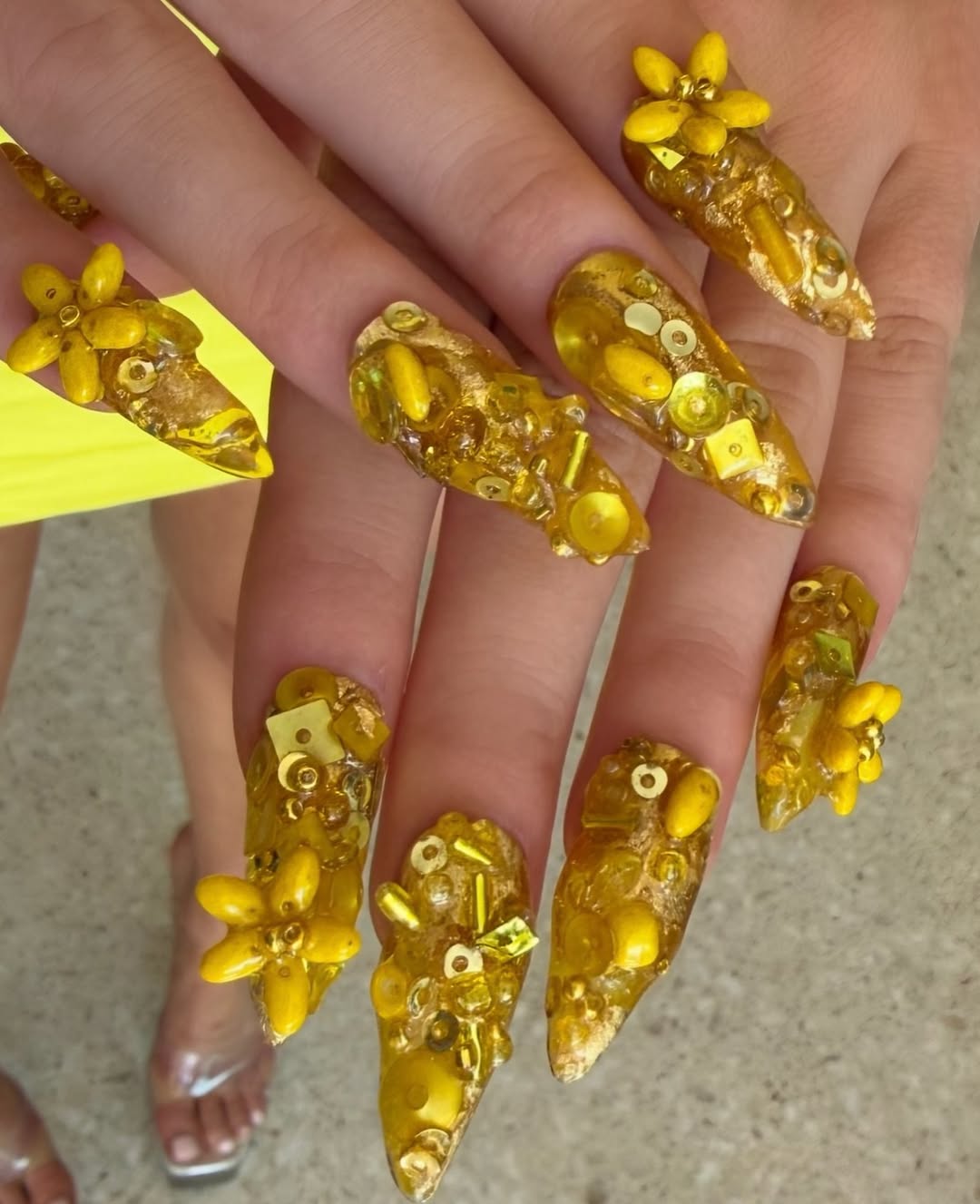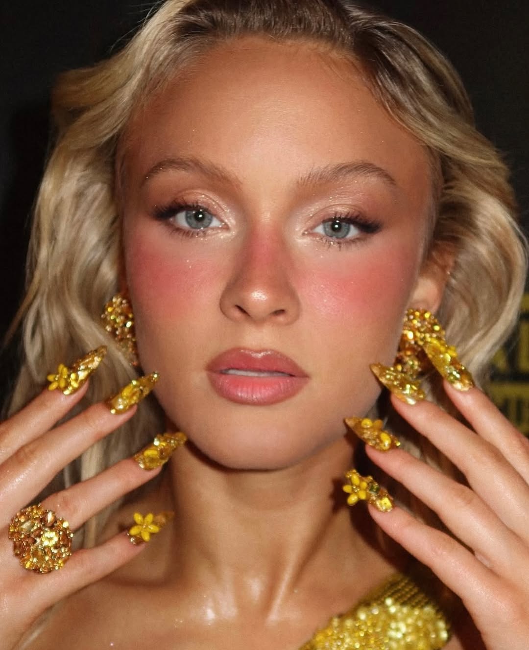 ส่วนสาวซัมเมอร์อย่าง Zara Larsson เลือกเล็บลายดอกไม้สามมิติสีเหลืองทองอร่าม ประดับด้วยลูกปัดหลากหลายชนิดขนาดเล็ก เข้ากับชุดและแอ็กเซสเซอรี่ส์ ทั้งบนพรมแดงและในการแสดงบนเวทีประกาศรางวัล ผลงานของ Juan Alvear ช่างทำเล็บชื่อดัง