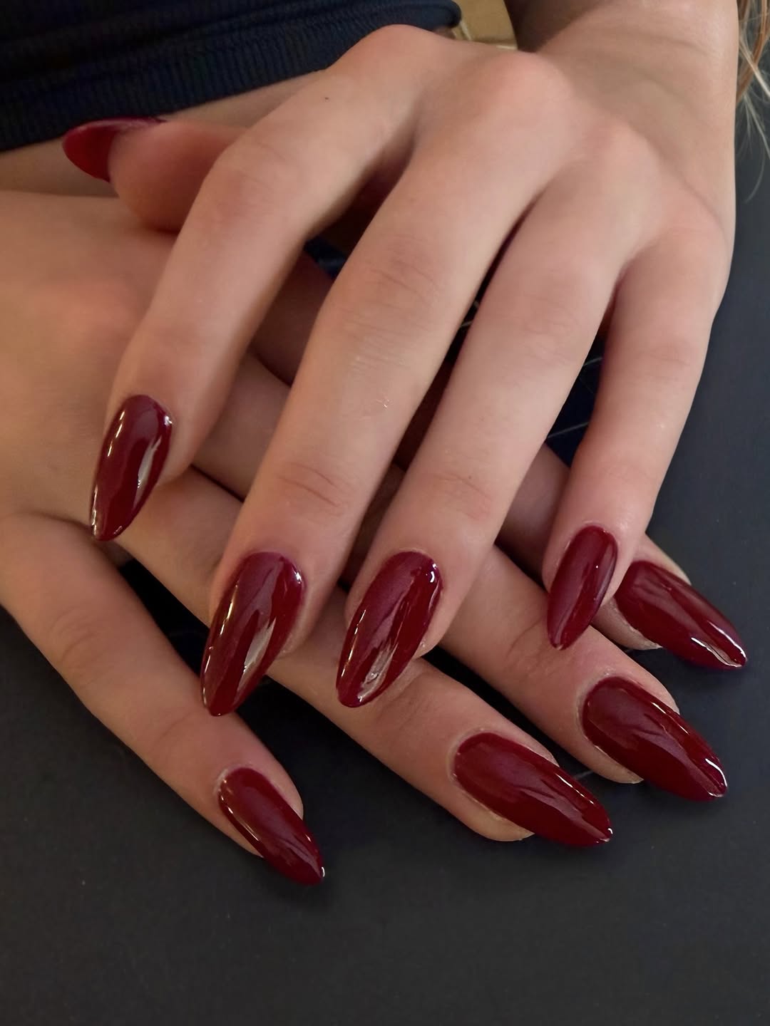 ทางด้าน Tate McRae เล็บทรงอัลมอนด์สีแดงเบอร์กันดีที่มาในฟินิชเรียบหรูดูคลีน ผลงานของช่างทำเล็บชื่อดังอย่าง Juan Alvear เช่นเดียวกันกับสาว Sabrina