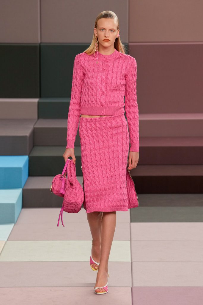 ความไอคอนิกอย่างลายดอกไม้ของ Fendi ถูกซ่อนไว้อย่างเชื่อมโยงทั้งในชุดหญิงและชาย โดยนอกจากนี้เองภายในคอลเล็กชั่นยังมีลวดลายอื่นๆ ที่ซ่อนอยู่บนสีพื้นทั้งการปักลาย ถักเชือก เลื่อมเพชร ผ้าลูกไม้ การเล่นกับแพตเทิร์นวงกลม รวมถึงงานร้อยลูกปัดหลากหลายขนาดที่ปรากฎอยู่บนกระเป๋า Fendi Collier และ Spy bag ที่กลับมาในรูปแบบใหม่จากผ้าไหมถักนิต นำมาแมตช์กับเครื่องประดับเงินและทอง รวมถึงแว่นตาทรง cat’s eye และรองเท้า FENDI Arco sling-back sandals ที่มีดีไซน์ถักผสมโซ่หนัง และรองเท้าส้นสูงที่มาในแม่สีหลักอย่างแดง น้ำเงิน ก็ชวนสะท้อนถึงกลิ่นอายในฤดูร้อนได้เป็นอย่างดี