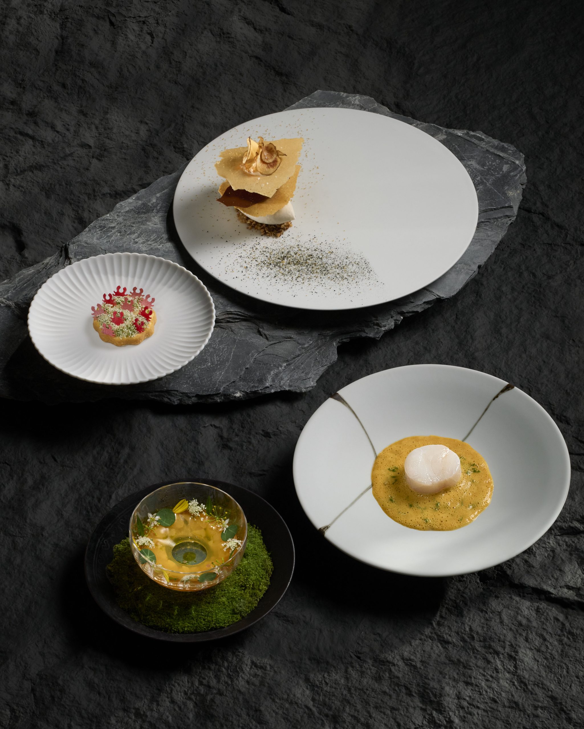 สานต่อรสชาติด้วย Shores of Kerala ที่นำเนื้อปลาค็อด ราดด้วยซอส Moilee กับแกงกะทิที่รังสรรค์จากมะพร้าว มะเขือเทศ มะขาม และใบแกง หรือไฮไลต์อย่างคอร์ส Fruits of Land and Sea ที่ประกอบด้วยทาร์ทาร์หอยเชลล์ฮอกไกโด แผ่นเจลลี่ส้มบางเบาและซุปใสรสซิตรัสที่ผสมผสานกับน้ำมันดิลล์หอมกรุ่น