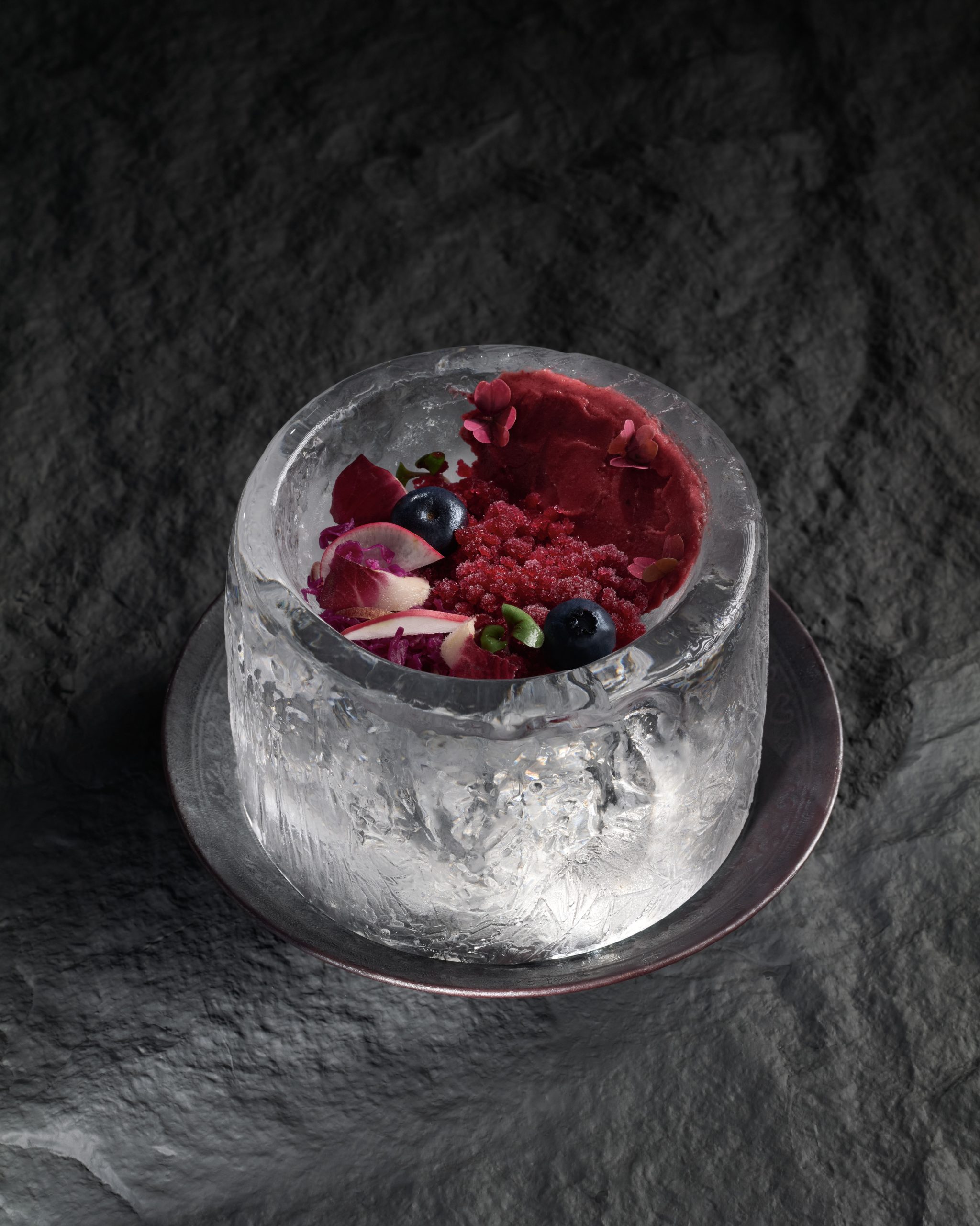 คงไม่มีอะไรเหมาะแก่การเฉลิมฉลองการเข้ามาสู่ฤดูกาลใหม่มากไปกว่าลิ้มลองวัตถุดิบที่ดีที่สุดประจำซีซั่น ซึ่งฤดูใบไม้ร่วงนี้ Gaggan at Louis Vuitton ก็ได้เสิร์ฟทั้งวัตดุดิบจากประเทศไทยและทั่วทั้งภูมิภาค โดยเราจะเริ่มต้นกันอย่างสดชื่นกับ Ice & Plants จากซอร์เบต์แบล็กเคอร์แรนต์และกะหล่ำปลีม่วง ซ้อนชั้นด้วยกรานิต้าชิโสะแดงเนื้อละเอียด ปิดท้ายด้วยสมุนไพรสีแดงและสีม่วงกรอบ ๆ ร้อยเรียงเข้าด้วยน้ำสลัดดาชิ เรียกว่าเริ่มต้นอย่างน่าติดตา เพราะเมนูนี้เสิร์ฟมาในน้ำแข็ง!
