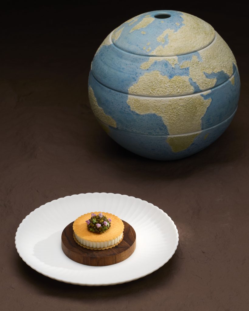 คอร์สอาหารอันขึ้นลื่อของ Gaggan at Louis Vuitton อย่าง World Map ที่สะท้อนปรัชญา ‘Spirit of Travel’ เองครั้งนี้ก็ได้นำเสนอคำเล็ก 3 รูปแบบที่เป็นตัวแทน 3 ประเทศสำคัญบนเส้นทางสายอาหารของเชฟ Gaggan ไม่ว่าจะเป็น ประเทศสหราชอาณาจักร กับสลัดชีสนมแพะและบีตรูตเสิร์ฟบนแครกเกอร์เนื้อที่เสริมรสด้วยพาร์เฟต์ไวต์ช็อกโกแลตและแยมเมเปิ้ล ประดับคาเวียร์ ต่อด้วยประเทศสิงคโปร์กับเมนู Pink Pepper Crab ที่ได้แรงบันดาลใจจากเมนูอาหารทะเลสุดยูนีกจากอิมัลชันมันปูเข้มข้นและเนื้อปูสดใหม่ เติมรสจัดจ้านด้วยน้ำสลัดฮันนี่มัสตาร์ดและพริกไทยสีชมพู ปิดท้ายด้วยปลายทางอย่างประเทศไทย ที่ชูเมนูเมี่ยงคำสุดล้ำด้วยใบชะพลูทอดกรอบที่ถูกเสิร์ฟในรูปแบบลูกกวาด สอดไส้กุ้งหวาน และปิดท้ายด้วยขิงสด พริก และใบมะกรูด