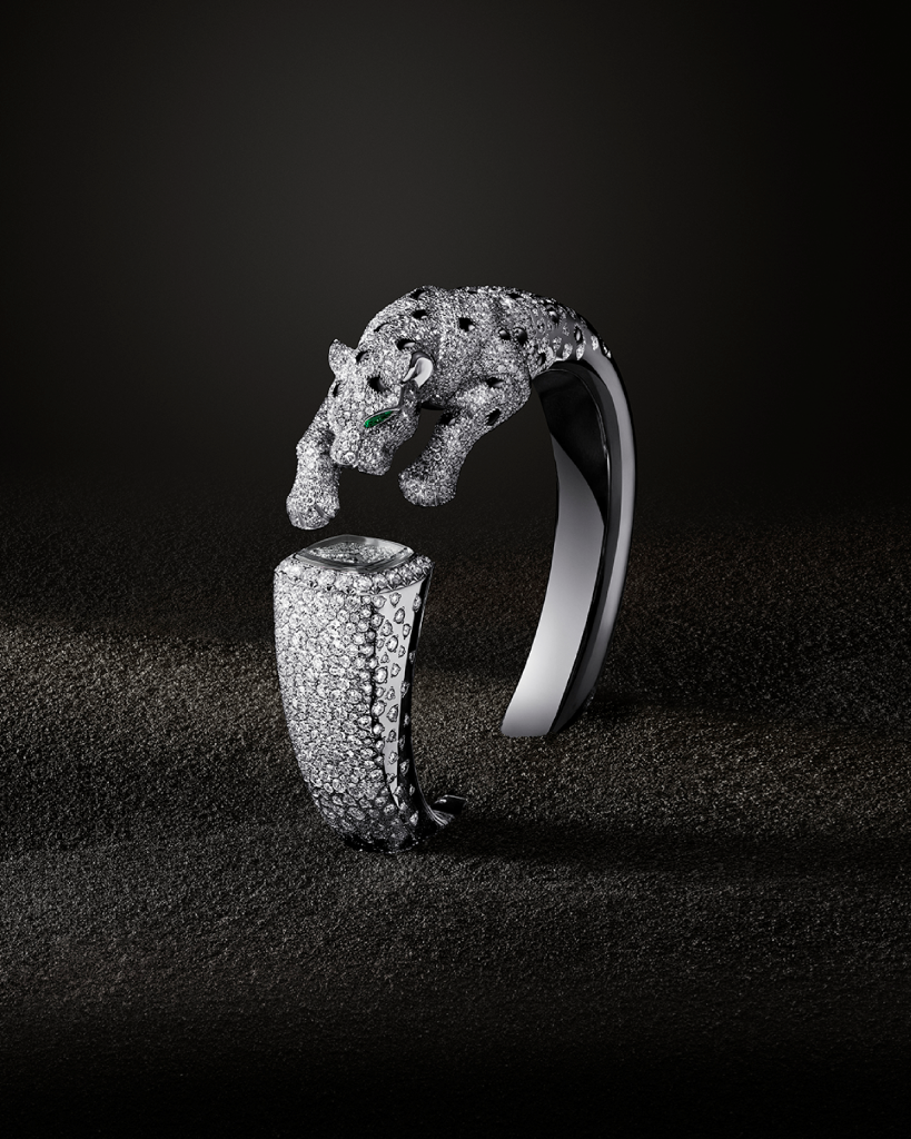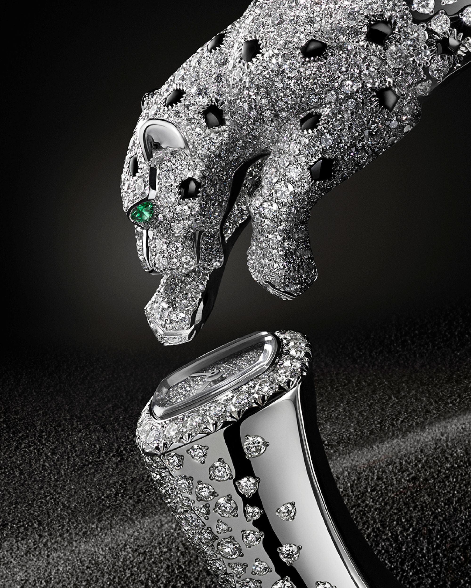 ไม่ว่าจะเป็นมัดกล้ามเพรียวงาม หรือรายละเอียดอย่างใบหู จมูก และอุ้งเท้าที่เต็มไปด้วยรายละเอียดสมจริง เรือนเวลานี้ยังถือเป็นเครื่องประดับอัญมณีหรูด้วยการประดับเพชรกว่า 1,100 เม็ด โดยช่างฝีมือของเมซงได้บรรจงรังสรรค์ขึ้นตามขั้นตอนอันละเอียดอ่อนของการผลิตเครื่องประดับ ตลอดจนงานฝีมือการขัดตกแต่งพื้นผิว และประดับฝังอัญมณีแบบ Fur setting ที่ต้องใช้ความละเอียดประณีตสูง เช่นกันกับเทคนิคเฉพาะในการพันโลหะรอบออนิกซ์เพื่อให้เกิดรายละเอียดของเส้นขนเล็กๆ รอบลายจุดของเสือแพนเตอร์ที่ดูเป็นธรรมชาติ