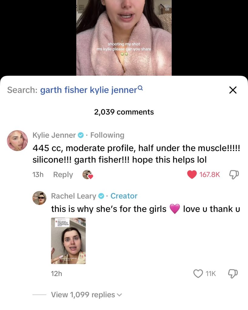 งานนี้ Kylie ไม่ปล่อยให้สงสัยนาน เธอคอมเมนต์กลับแบบหมดเปลือกว่า “445 cc, moderate profile, half under the muscle!!!!! silicone!!! garth fisher!!! hope this helps lol” หรือแปลได้ว่าเธอใช้ซิลิโคนแบบโปรไฟล์กลาง ขนาด 445cc วางใต้กล้ามเนื้อครึ่งหนึ่ง และทำกับคุณหมอ Garth Fisher เรียกได้ว่าเป็นคำตอบที่ทั้งชัดเจน ตรงไปตรงมา และเป็นกันเองแบบสุดๆ จนกลายเป็นไวรัลในทันที