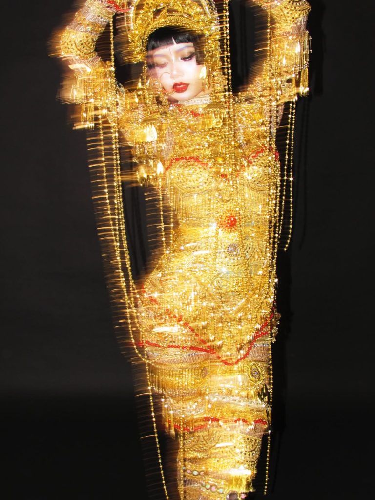 ในลุคนี้สาวลิซ่ามาในเมกอัพแนวอาร์ตแบบจัดเต็ม โดดเด่นด้วยดวงตาที่เฉี่ยวคม เสริมเส้นกราฟิกไลเนอร์สีแดงและน้ำเงินที่ให้ลุคดูเหนือจริง คิ้วย้อมด้วยสีน้ำเงินเข้ากับอายเมกอัพอย่างลงตัว ริมฝีปากทาด้วยลิปสติกสีแดงสดและประดับคริสตัลสีแดง เพิ่มความระยิบระยับให้ลุคดูลึกลับและทรงพลังยิ่งขึ้น เสริมความดรามาติกด้วยเส้นสีแดงผ่ากลางใบหน้า สื่อถึงเอกลักษณ์ของคาแรกเตอร์ฆีบาโรได้อย่างชัดเจน