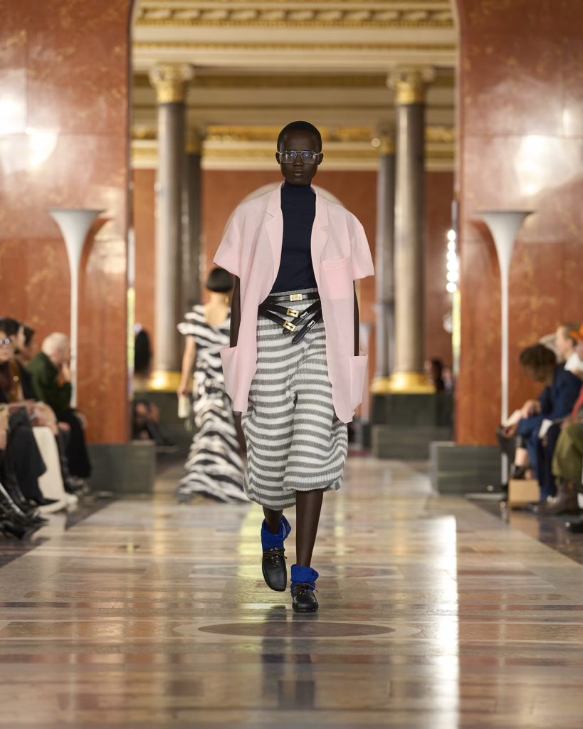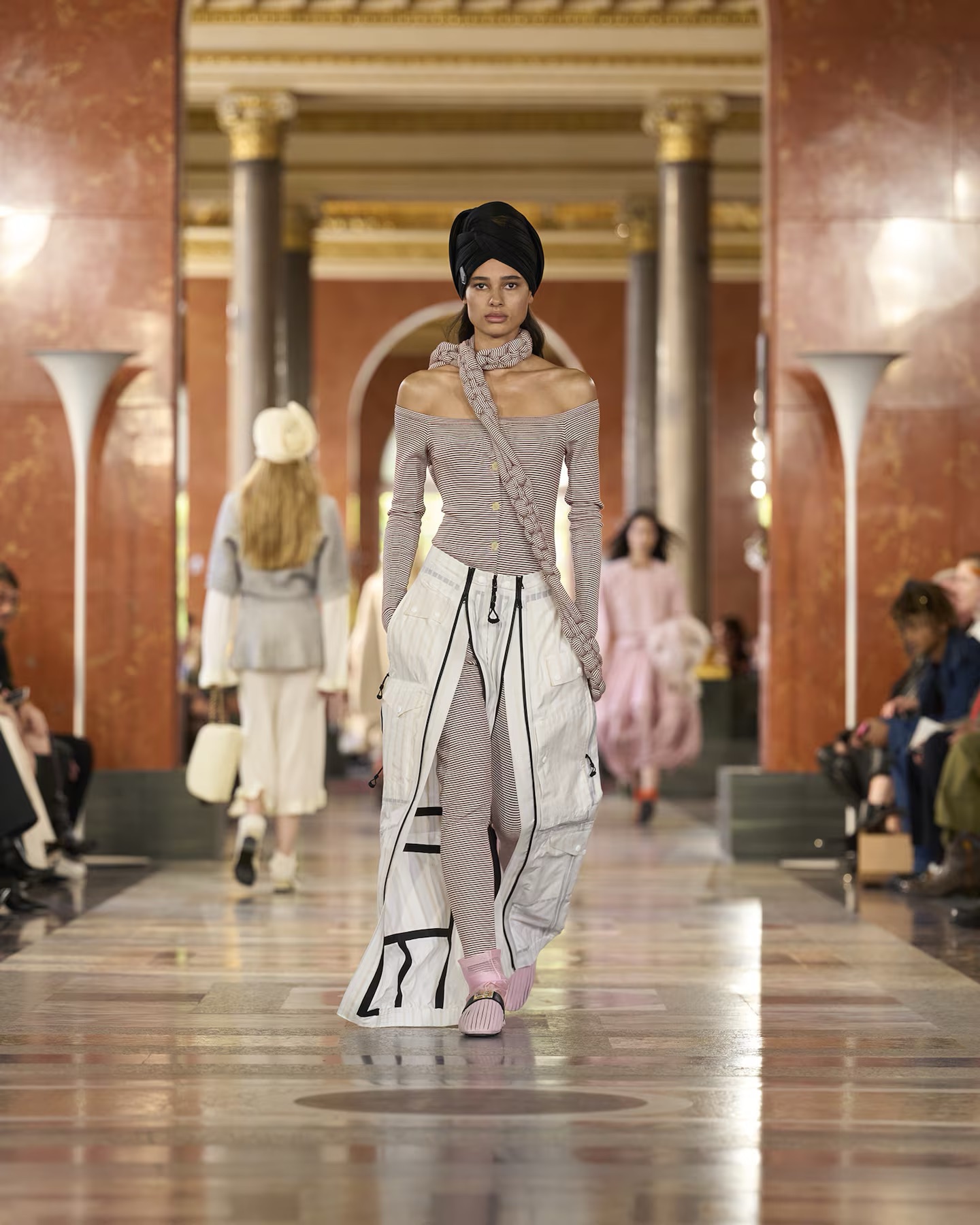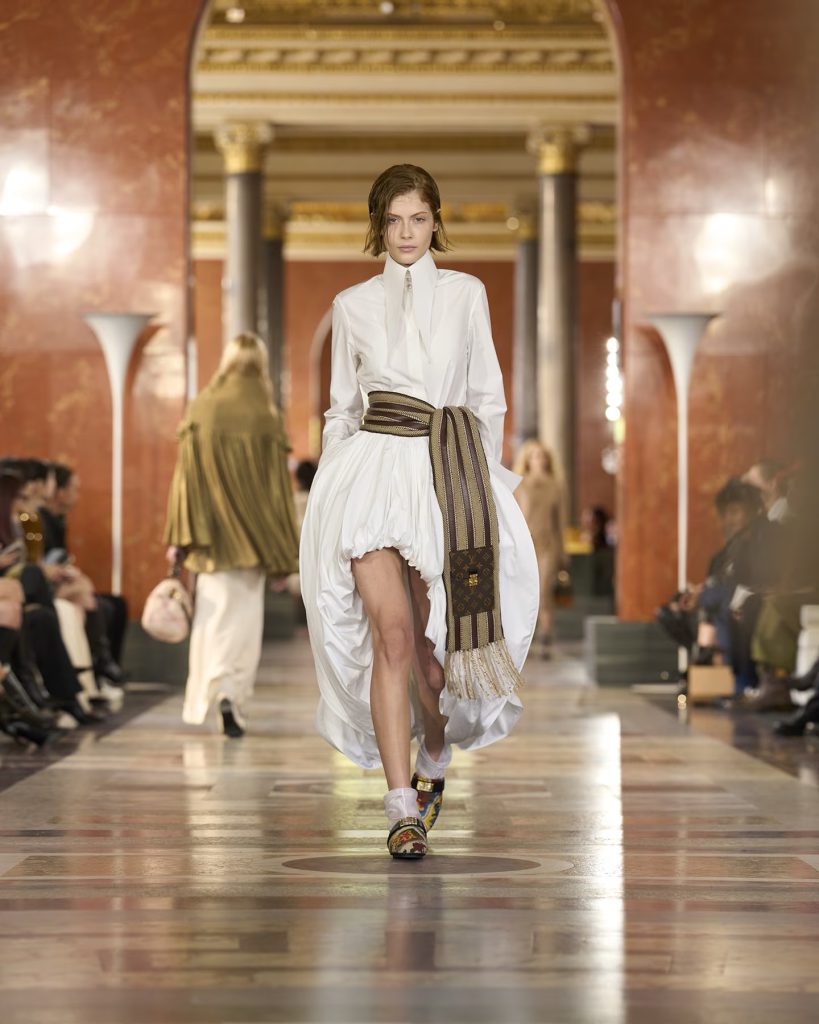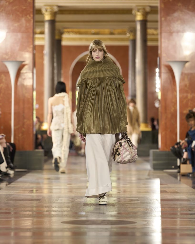 ในด้านเสื้อผ้า Nicolas Ghesquière ปลดปล่อยโครงสร้างและอารมณ์ของการแต่งตัวออกจากกรอบเดิม เสื้อผ้าในคอลเล็กชั่นเน้นความเสรี ทั้งเสื้อตัวโคร่ง กางเกงเนื้อบาง และชุดเดรสที่ได้แรงบันดาลใจจากชุดนอน ถูกจับคู่กับโครงเสื้อทหาร หรือโค้ตโครงสร้างแปลกตา เลเยอร์ผ้าโปร่ง เช่น ชีทรู ชีฟอง และซิลก์ ถูกตัดต่อกับผ้าที่มีโครงสร้าง เพื่อสร้างมิติเมื่อเคลื่อนไหว บางชิ้นเลือกผ้าซาตินหรือผ้าเงา ตัดเข้ารูปเพื่อเล่นกับแสงเงาและสร้างความหรูหราแบบ subtle glam ดีเทลงานปักหรือแอ็กเซสเซอรี่ส์อย่างกระเป๋าและรองเท้าถูกแทรกด้วยลูกเล่นสนุกๆ ที่ช่วยเพิ่มความสดใสและบุคลิกให้แต่ละลุค