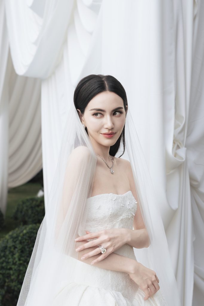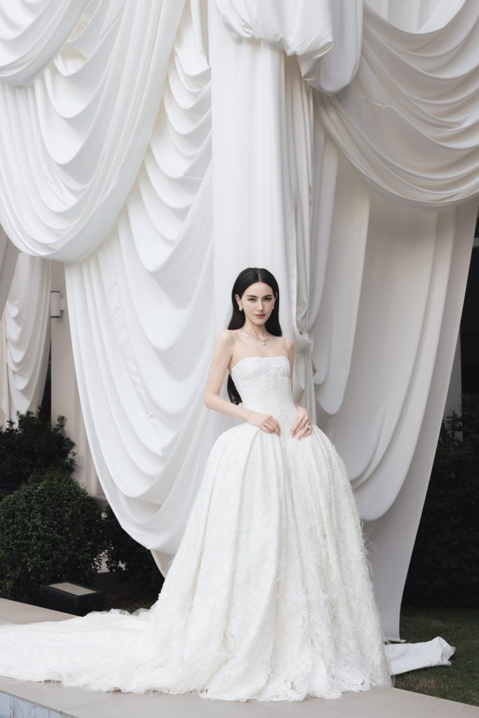 โดยชุดของ ใหม่ ดาวิกา นั้นเป็นชุดเจ้าสาวผ้าลูกไม้สีขาวไอวอรี่ทั้งตัว ได้รับการออกแบบตัดเย็บเป็นสองเลเยอร์ เลเยอร์แรกมาในแบบคอร์เซ็ตผ้าลูกไม้ติดกับช่วงล่างซึ่งเป็นกระโปรงผ้าลูกไม้กับลวดลายดอกไม้นานาพันธุ์ อีกทั้งยังมีผีเสื้อตัวน้อยจากผ้าลูกไม้ Guipure แบบสามมิติ กว่า 1,700 ตัว แต่งแต้มความงามตั้งแต่ช่วงเอวจรดชายกระโปรง ซึ่งช่างฝีมือใช้ทักษะขั้นสูงในการตัดเย็บทั้งหมดด้วยมือทีละตัว ผ่านงานปักอย่างประณีตกว่า 120 ชั่วโมง พร้อมดีเทลขนนกนุ่มละมุนสีไอวอรี่เป็นระยะที่ตัวกระโปรงชั้นนอก กว่า 6 เมตร ซึ่งสามารถถอดกระโปรงนอกออกได้เพื่อความงคล่องตัวในช่วงงานเลี้ยงและอาฟเตอร์ปาร์ตี้ แมตช์กับเวลคลุมศีรษะและรองเท้าที่ตกแต่งด้วยคริสตัล Gucci Bamboo สุดไอคอนิกและคอมพลีตลุคด้วยเครื่องประดับจาก Bvlgari