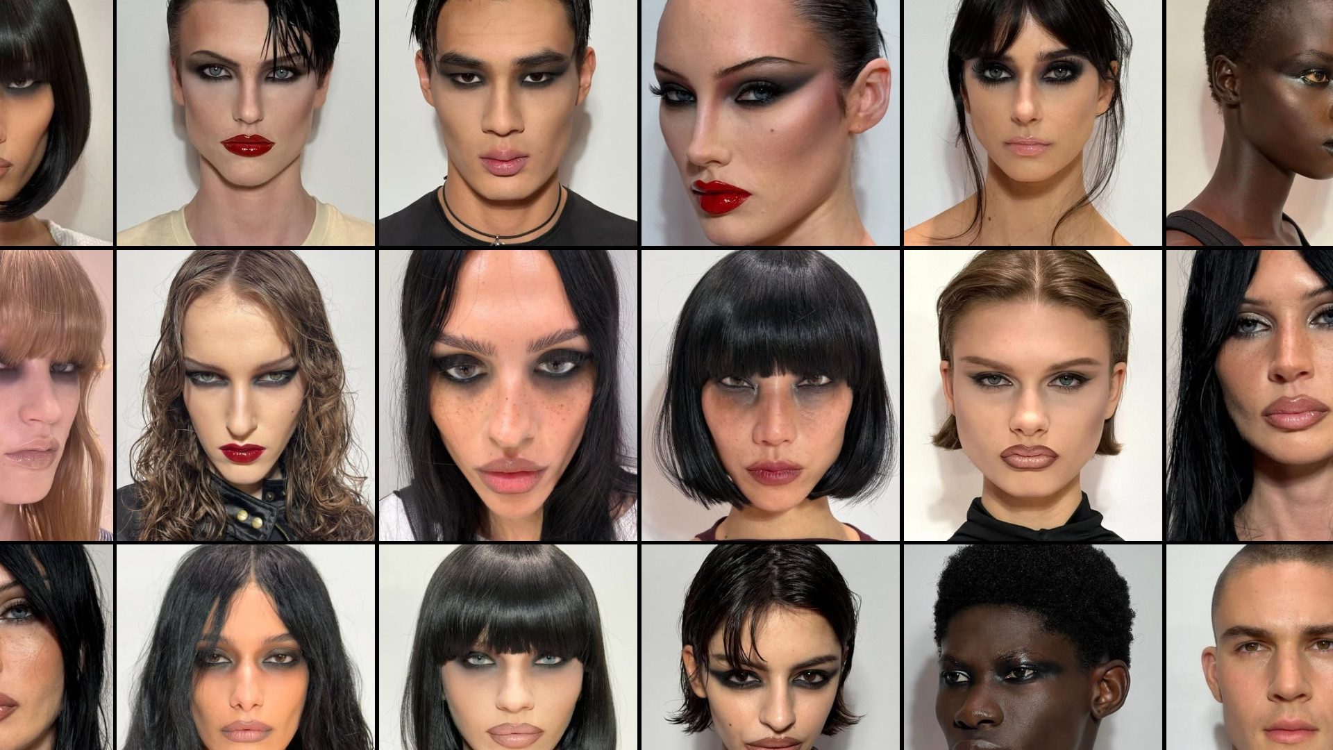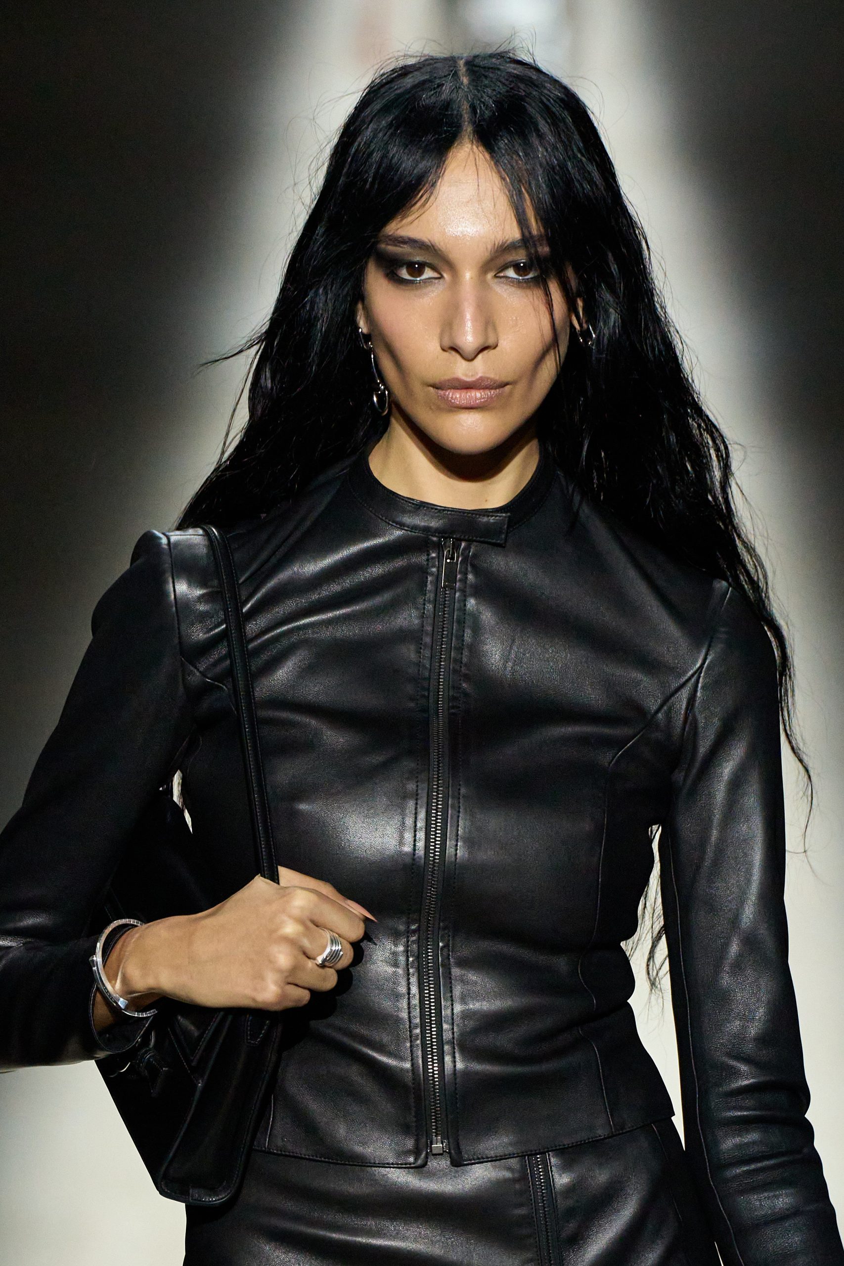 หัวใจสำคัญของลุคนี้อยู่ที่สโมกกี้อายสีดำที่ฟุ้งเลอะอย่างตั้งใจ ราวกับเมกอัพที่ค้างคืนจากปาร์ตี้ โดย Sam Visser เมกอัพอาร์ทิสต์ผู้อยู่เบื้องหลังลุคบนรันเวย์ เลือกสโมกกี้อายแบบแม็กซิมัลลิสต์ที่อัดแน่นด้วยอายไลเนอร์สีดำเป็นคีย์หลัก เสริมด้วยการคอนทัวร์คมเข้มและคิ้วเรียวบาง สร้างอารมณ์ดิบ เท่ และเซ็กซี่แบบไม่เกรงใจใคร