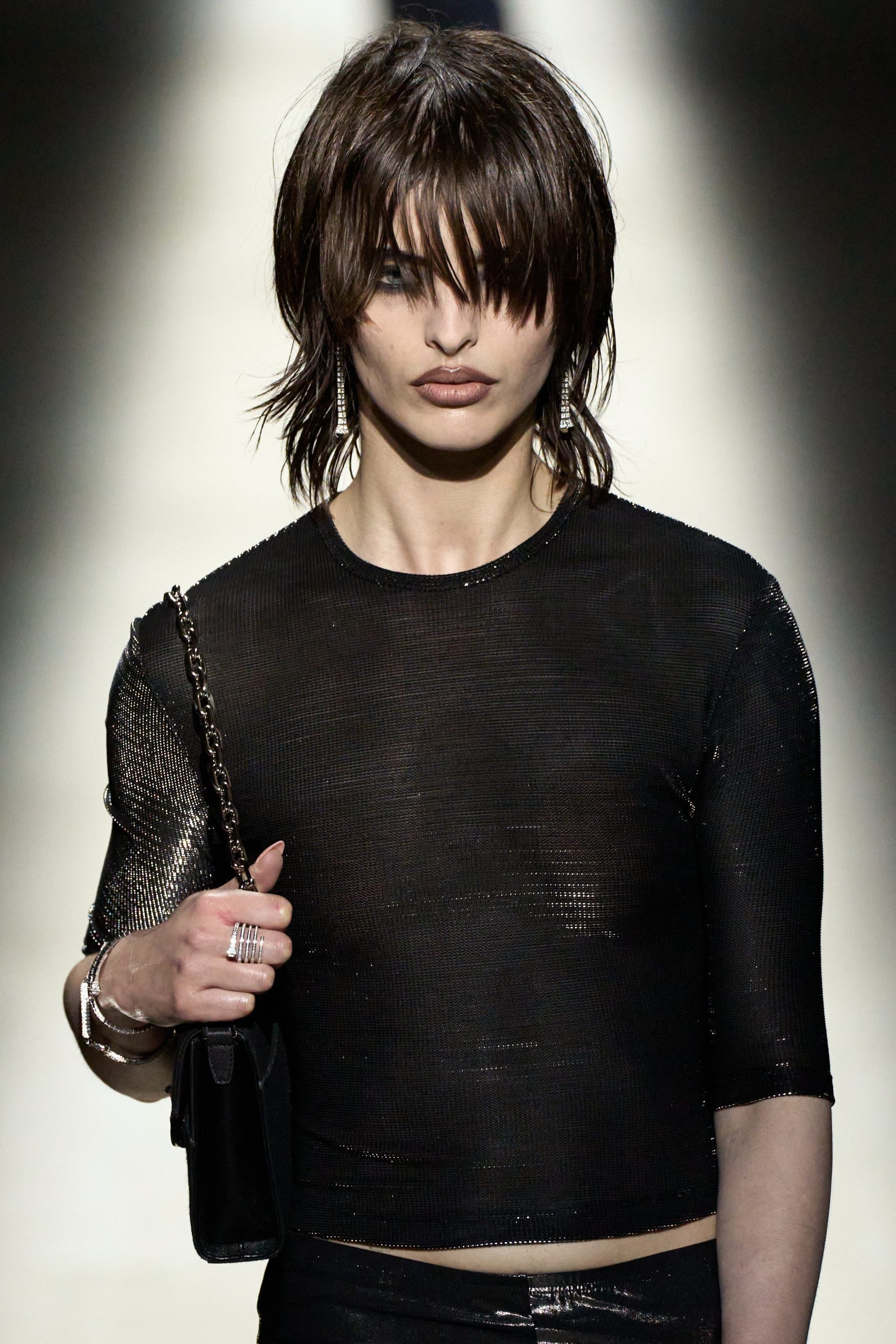 บนรันเวย์เราได้เห็นสาวปาร์ตี้ในหลายเวอร์ชั่น อย่างบางลุคจับคู่กับลิปสติกสีแดงสดฉ่ำเงา บางลุคเน้นการเขียนขอบปากด้วยลิปไลเนอร์สีเข้ม ขณะที่ทรงผมก็หลากหลาย ตั้งแต่ผมเรียบตรงเนี้ยบ ผมลอนยุ่งแบบไม่ตั้งใจ ไปจนถึงลอนเด้งสไตล์ซูเปอร์โมเดลในยุค ’90s อีกด้วย