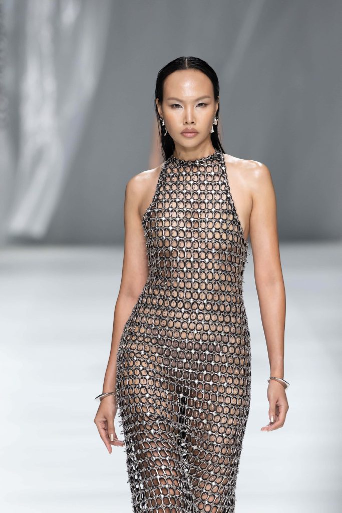 ปิดท้ายด้วยนางแบบผิวดำชาวอังกฤษผู้เคยร่วมเริ่มแบบให้กับ Victoria’s Secret มาแล้ว ก็ได้ร่วมเดินพรมแดงในชุดราตรีสุดตระการตาจากแบรนด์ SIRIVANNAVARI คอลเล็กชั่น Spring/Summer 2025 ด้วยเช่นกัน โดยชุดราตรีนี้ได้แฝงด้วยดีเทลสร้างสรรค์และประณีตมากมาย ไม่ว่าจะเป็นผ้าคอตตอนฉลุที่วางคัตติ้งและแพตเทิร์นผ้าให้สวยตัดเย็บสู่ชุดเดรสเข้าทรง แล้วจึงนำไประดมงานปัก ตอกหมุด และตกแต่งด้วยเม็ดโลหะอย่างละเอียดในทุกอณูผืนผ้า ขณะที่ระหว่างช่องวงกลมก็ได้ถูกเติมแต่งด้วยคริสตัล และลูกปัดแก้ว สร้างความระยิบระยับ มีชีวิตชีวายามเคลื่อนไหว