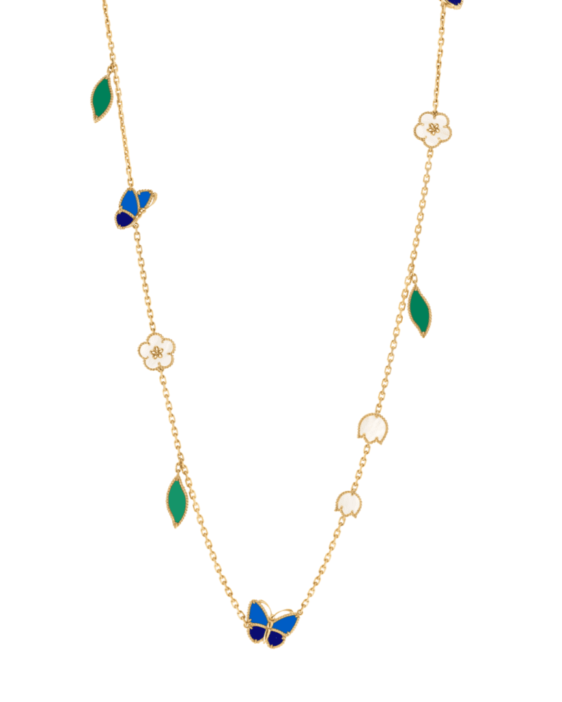 ความละเมียดละไมอีกด้านคือการถอดรหัสและความเป็นธรรมชาติอย่างแท้จริงของมวลดอกไม้และสรรพสัตว์ตัวน้อยมาอยู่บนชิ้นงานจิวเวลรี่ได้อย่างมีชีวิตชีวา ซึ่งต้องใช้ทักษะและองค์ประกอบด้านพฤกษชาติมาประกอบร่วมกัน เช่นเดียวกับการออกแบบ งานฝีมือและศิลปะหลากหลายแขนงที่นำมาใช้อย่างผสมผสาน เช่น การรังสรรค์โมทิฟแต่ละชิ้นแบบอสมมาตร หรือไม่จำเป็นต้องมีสัดส่วนเท่าๆ กันซึ่งถอดแบบมาจากธรรมชาติโดยแท้ หรือการคัดสรรพลอยและอัญมณีด้วยเฉดสีที่ไล่เฉด แม้ระดับของโทนสีจะต่างกัน แต่ก็ดูเป็นธรรมชาติและกลมกลืนเข้ากับชิ้นงานโดยรวมได้อย่างดี ในคอลเล็กชั่นนี้ ยังมีไฮไลต์ชิ้นเด่น อย่าง สร้อยคอยาวเยลโลว์โกลด์ Lucky Spring Butterfly ที่เรียงร้อยด้วยโมทิฟหลากหลายเฉดสีและรูปแบบ ทั้งผีเสื้อกางปีก 3 ตัวประดับบนปีกด้วยลาพิสลาซูลีและอาเกตสีฟ้าสดใส สลับคั่นกับโมทิฟใบไม้ประดับอาเกตสีเขียว โมทิฟดอกเหมยและดอกลิลลีออฟเดอะวัลเลย์สีขาวประดับด้วยเปลือกหอยมุก สร้อยคอยาวนี้ยังสามารถสวมใส่เข้าชุดกับทั้งแหวนหว่างนิ้วเยลโลว์โกลด์ หรือเข็มกลัดเยลโลว์โกลด์ และสร้อยข้อมือเยลโลว์โกลด์ Lucky Spring Butterfly ที่มาในธีมการตกแต่งด้วยผีเสื้อและดอกไม้แห่งฤดูใบไม้ผลิเดียวกันได้ด้วย